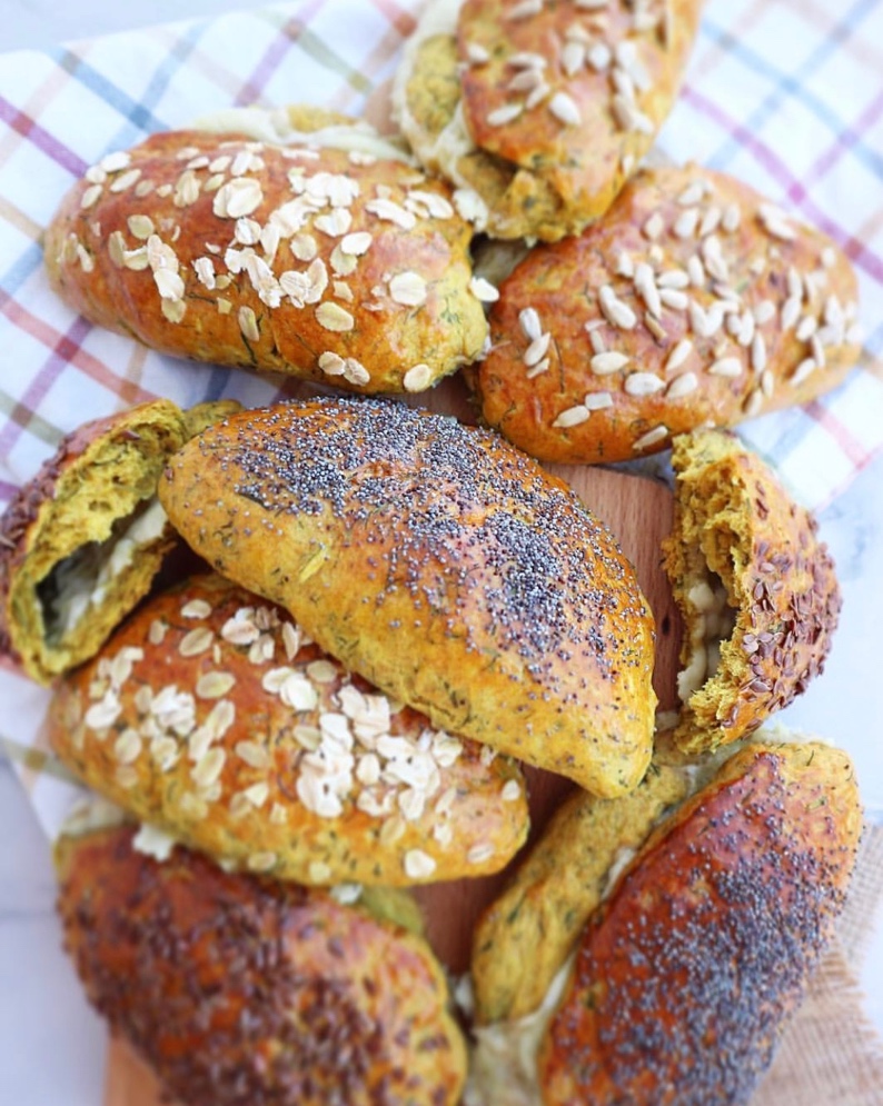 Mayalanan hamuru oklava yardımıyla açın. Tereyağını, açtığınız hamurun tüm yüzeyine yedirin. Kaşık yardımı ile de iç malzemeleri ekleyin. Ardından rulo haline getirin.