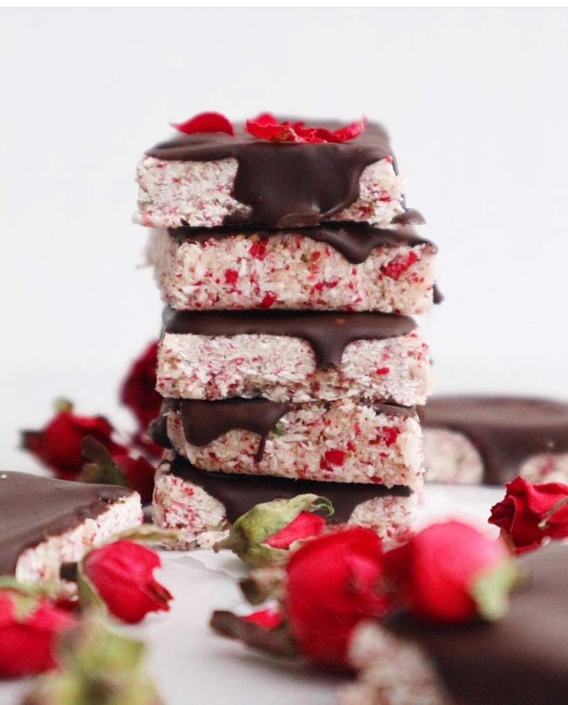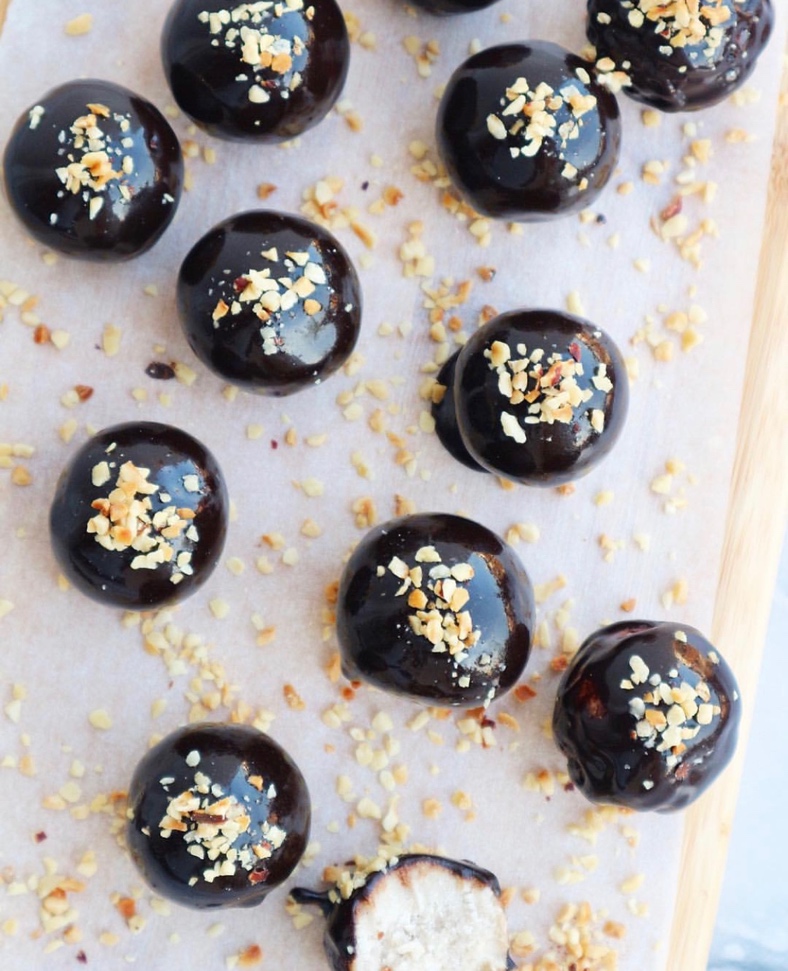 Ben-Mari usulü erittiğiniz bitter çikolatayı ve Hindistan cevizi yağını üzerine gezdirin. 10 dakika kadar daha dondurucuda dinlendirin ve servis edin.