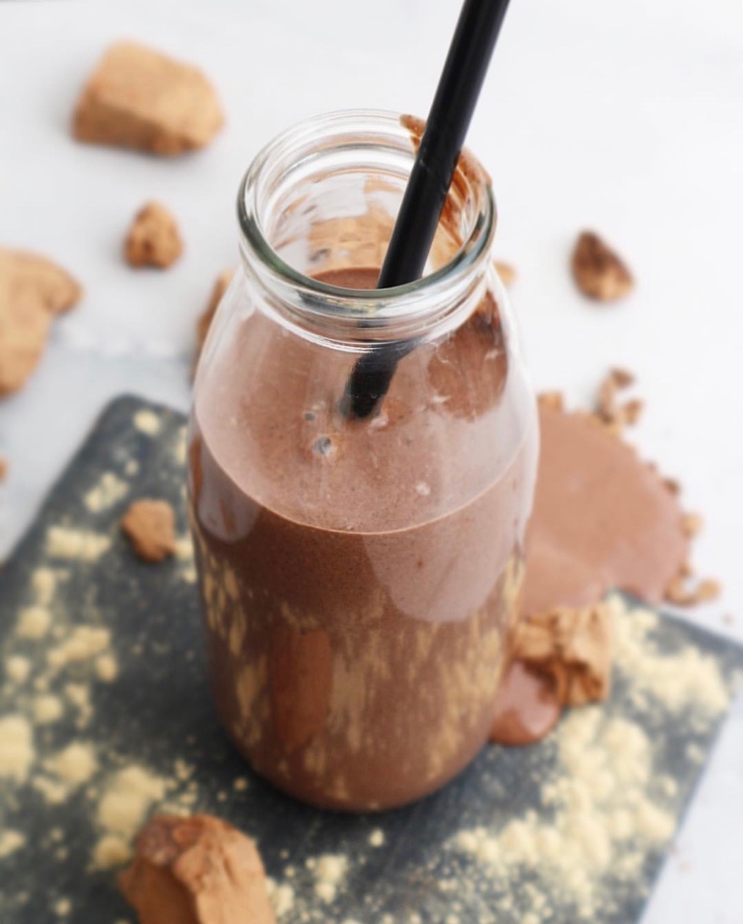 Muzu kabaca dilimleyin. Kakao ile birlikte pürüzsüz oluncaya dek mutfak robotundan geçirin. Derin bir kaba aktarın.