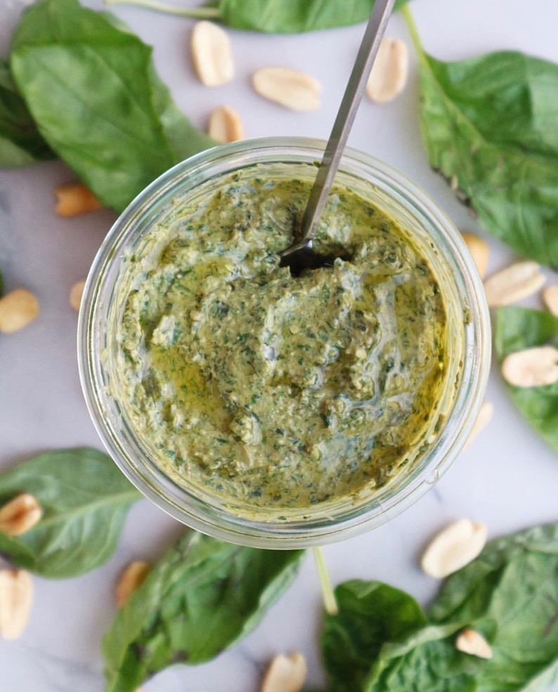 Fesleğeni, parmesanı, zeytinyağını, yer fıstığınıi sarımsağı, tuzu ve karabiberi birlikte pürüzsüz oluncaya dek rondodan geçirin.