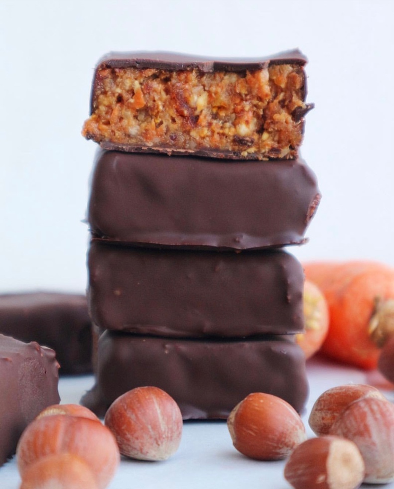 Muffin kaplarının tabanına 1 yemek kaşığı kadar gün kurusu-fındık karışımdan ekleyin ve elinizle bastırın. Üzerine yaş karışımını ekleyin. Her bir kap için aynı işlemleri tekrarlayın. Üzerine kabak çekirdeği içi ekleyin ve derin dondurucuya kaldırın.